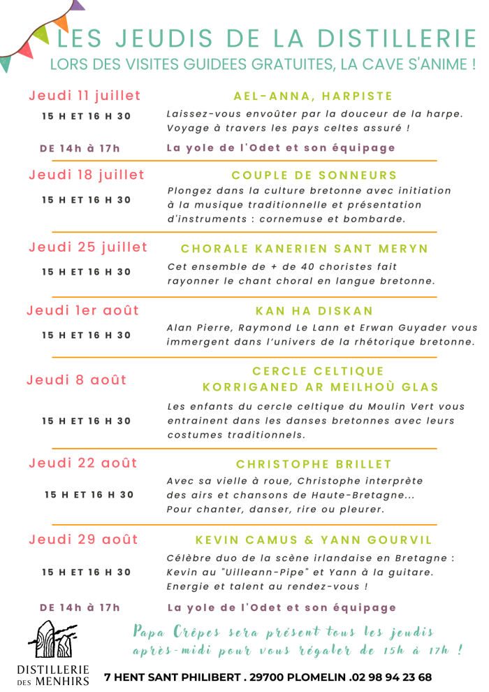 Cet été, nous vous donnons rendez-vous tous les jeudis du11 juillet au 29 août à la Distillerie des Menhirs. (Fermeture le jeudi 15 août)