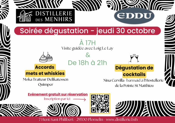 Ensuite, nous vous accueillons dans la salle des alambics à partir de 18h et jusqu’à 21h pour vous présenter nos trois nouveautés en compagnie de Nina Cervilla –barmaid à l’Hostellerie de la Pointe St Matthieu ainsi que d’Emmanuelle Genoud – cheffe de Moka Traiteur Delikatessen.